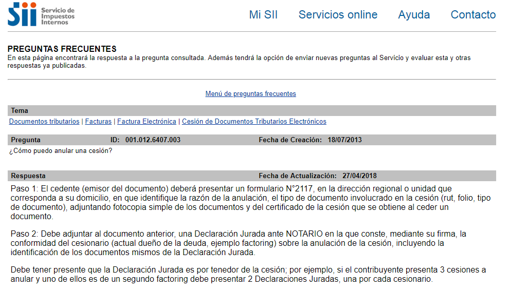 Para anular cesiones, el cliente debe asistir a la oficina del SII a realizar la solicitud de anulación de cesión según se indica en la siguiente imagen: